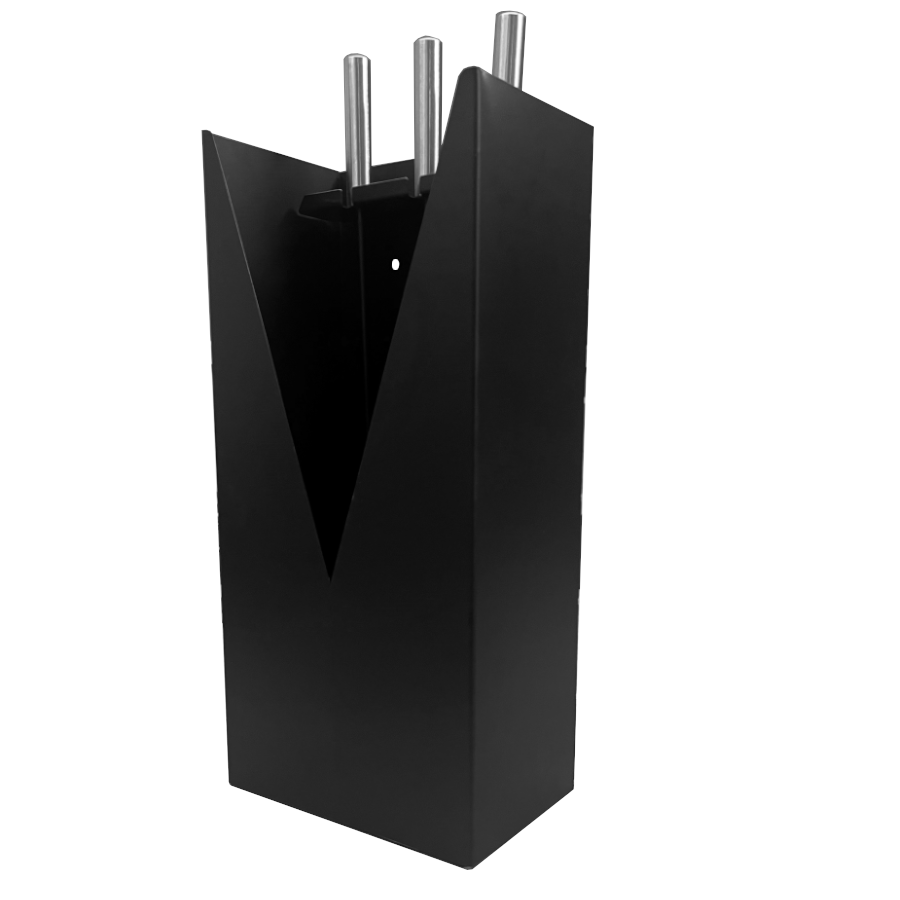 The black-painted housing keeps any ash and dust inside and it can either be placed on the floor or wall mounted.